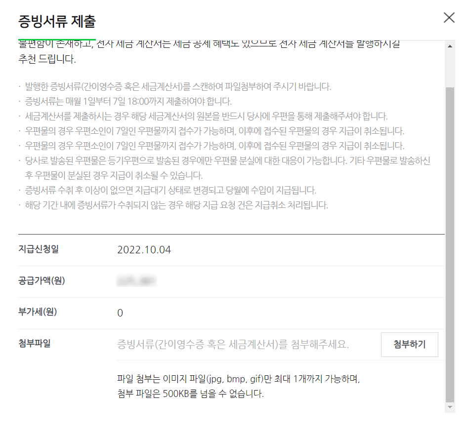 증빙서류 제출 란에서
