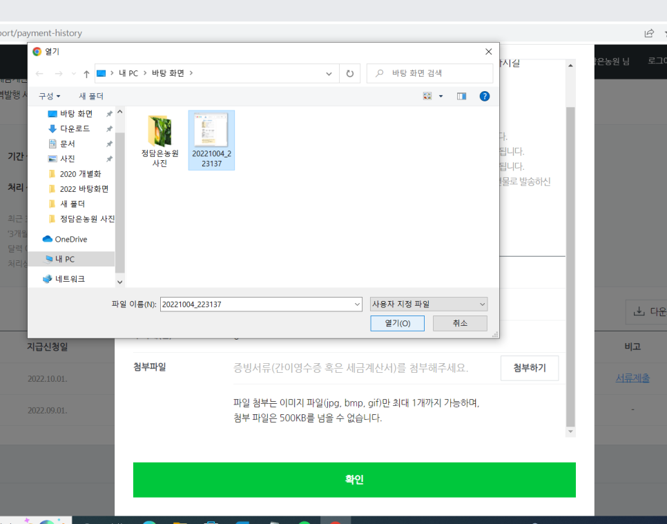 첨부하고 확인 버튼을